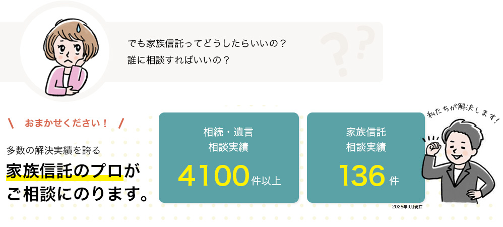 さまざまなケースに対応してきた家族信託の専門家が対応いたします。家族信託専門士の資格をもつ司法書士がしっかりサポートします。