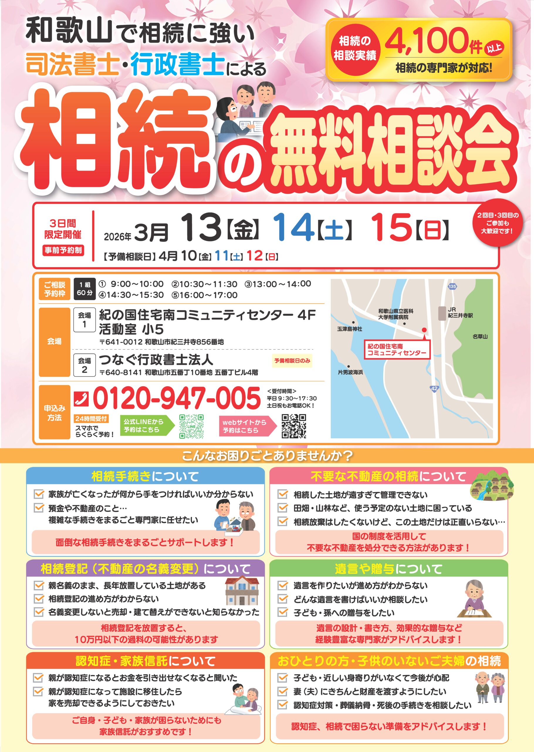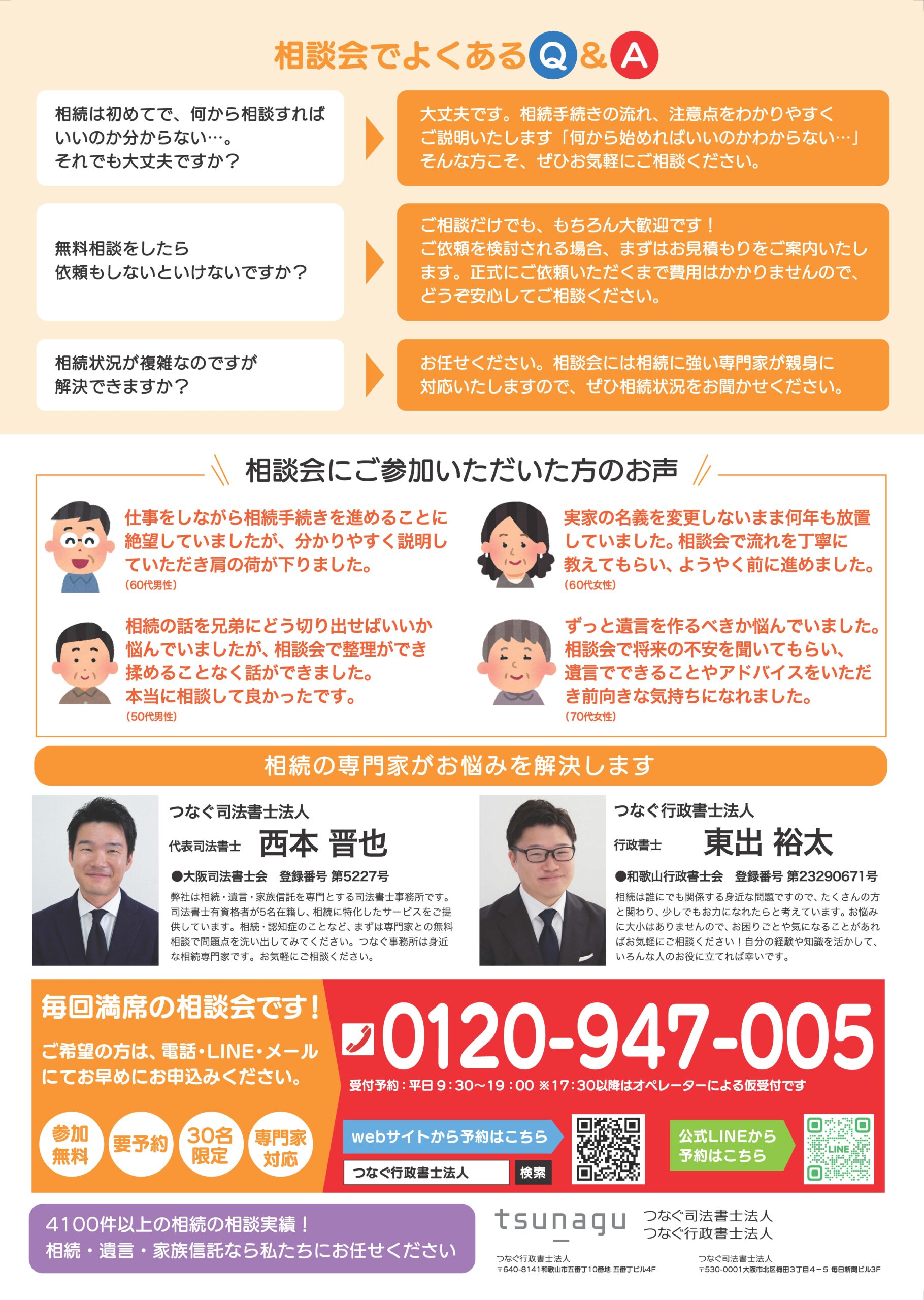紀の国住宅南コミュニティセンターで、相続の無料相談会を開催します。 ご予約はお電話もしくは問い合わせフォーム・公式LINにてお申込みください。